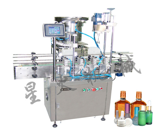 适用范围:主要适用于螺丝纹平头塑料盖旋盖拧紧,例:润滑油桶、矿泉水瓶、药瓶、日化用品、饮料瓶等。机构特征:2套下盖振盘+1套理盖机+3套旋盖头技术参数:整线功率:2KW/220V交流三相四线电源 气源:0.5-0.8MPa 放盖速度:15-20瓶/分钟 旋盖速度:20-30瓶/分钟注:如有特殊要求,我公司可进行量身定做!