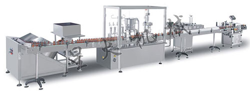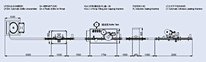 理瓶(GP62)圆盘供瓶机 + QX-4塑料瓶的净化气洗瓶机 + YG4/1四泵液体灌装旋(轧)盖-体机 + FL电磁感应铝箔封口机 + 不干胶贴标机